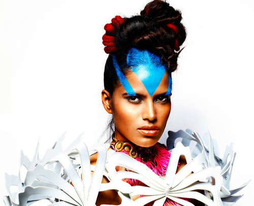 i was looking into 'editorial tribal makeup' for more inspiration on my editorial look and came across a tumblr that featured all the images from the march 2012 Vogue India shoot with preeti dhata and nina singh. the bright bold colours are the kind of colours i want to use in my catwalk image on my pale blonde model.